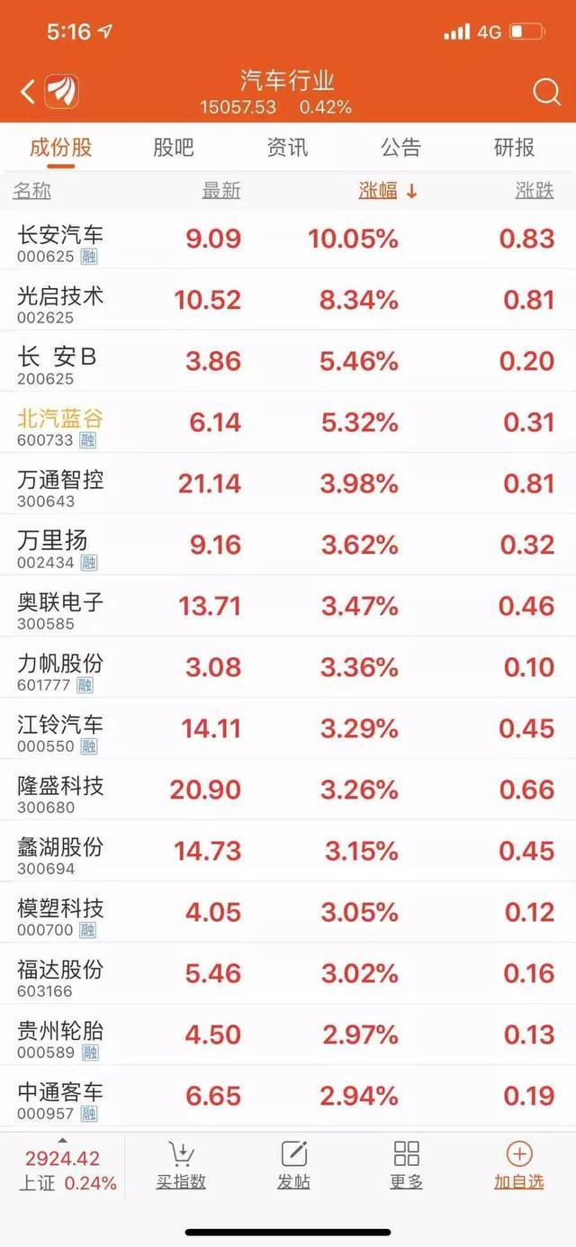 盤面上,汽車整車板塊領(lǐng)漲,長安汽車(000625)漲停,報收價9.09元/股。光啟技術(shù)(002625)、北汽藍谷(600733)漲幅超5%,力帆股份(601777)、江鈴汽車(000550)、長城汽車(601633)、廣汽集團(601238)等個股跟漲。