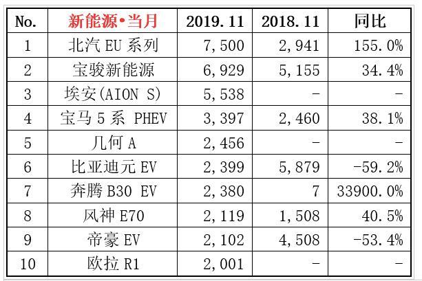 具體車型來看,北汽EU系列憑借11月熱銷7500輛的成績(jī)奪得11月新能源車車型TOP10排行榜的冠軍;亞軍則為寶駿E系列,銷量為6929輛,同時(shí)寶駿E系列也是A00級(jí)市場(chǎng)的銷量冠軍。