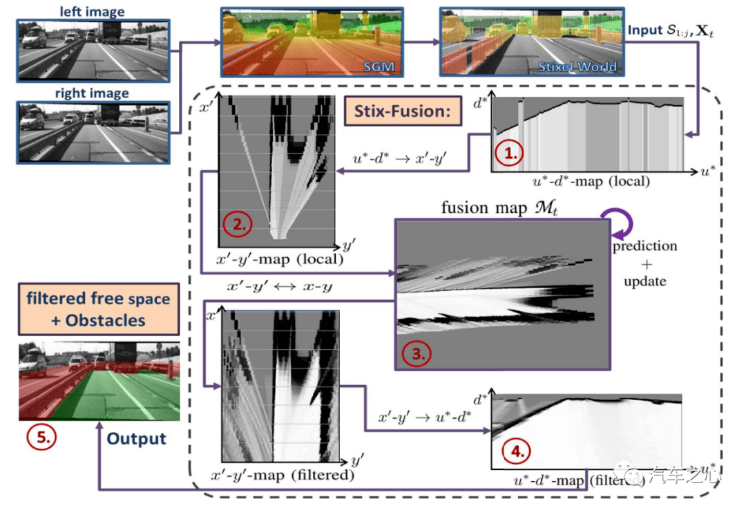 上圖為奔馳的 Road Surface Freespace Segmentation 流程圖,奔馳為縮小運算量,提出 Stixel概念,Stixel 算法將物體抽象成立在地面上的一根根的 Sticks,。