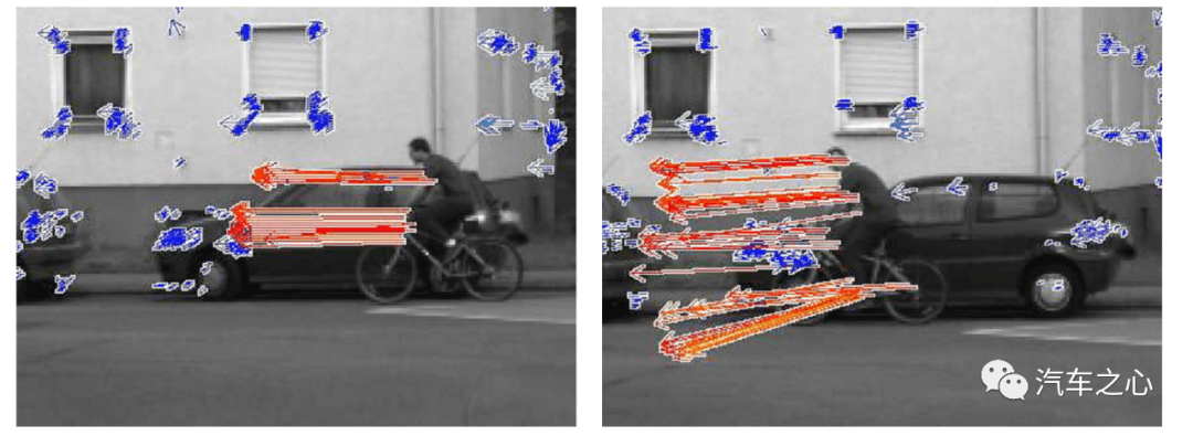 上圖為奔馳的光流法,奔馳用 Stixel 降低運算量,在量產車上也用了光流追蹤。圖上箭頭就是騎自行車人的 0.5 秒后的移動位置,右邊是 0.5 秒后的景象,可以與預測位置做一個對比。