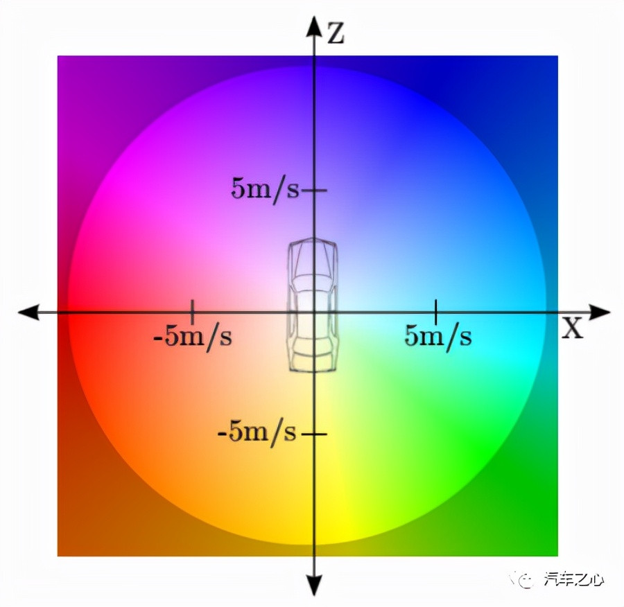 顏色編碼示意圖如左,不僅包括了速度還包括方位角,對移動目標位置預測非常有用。