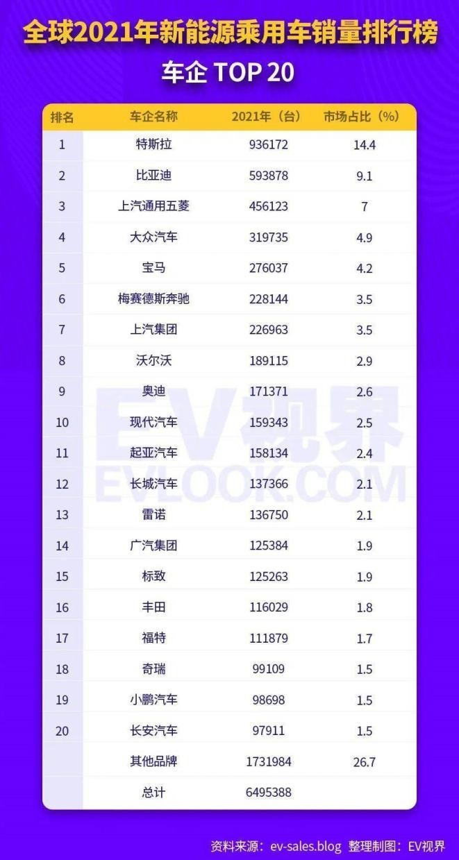 而今天說話的主角,卻正是2021年全球新能源汽車的銷量之王。從圖中我們可以看出,特斯拉去年以超過93萬輛電動車的成績奪去了全球14.4%的市場份額,與第二名的比亞迪拉開了不小的差距。盡管上汽、長城、奇瑞、小鵬、長安在這場銷量的比拼中取得了不錯的成績,但仍舊是依托于中國龐大的新能源市場,與BBA、大眾、豐田、現(xiàn)代起亞等具有全球影響力的車企相比,國產(chǎn)車的身影要顯得格外單薄。