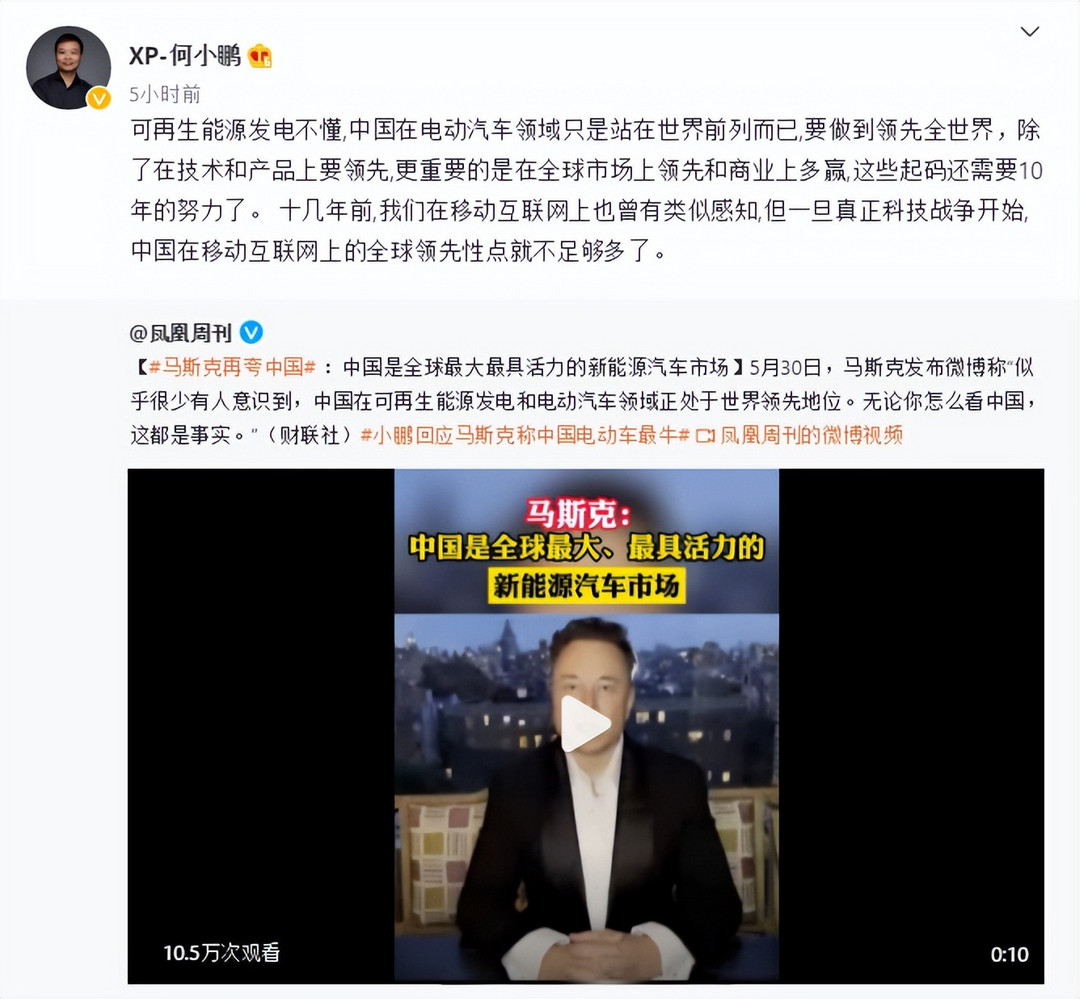 對于何小鵬的言論,我愿稱之為“人間清醒”。以前聽過一句話:當(dāng)一個人夸贊你時,必定是有求于你或想在你身上獲得好處。馬斯克“吹捧”中國電動車,以我愚見,不過是想在中國市場上保持高速增長而獲取用戶好感的場面話而已。