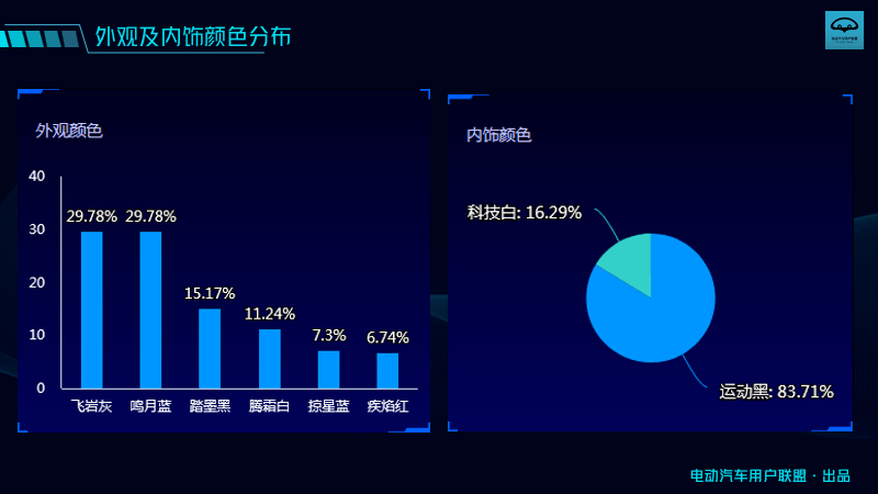 用戶所選的車型配置,主要以CLTC工況619公里的長續(xù)航后驅版車型為主,外觀選擇最多的是灰色和藍色,內飾則83.71%的人選了黑色。