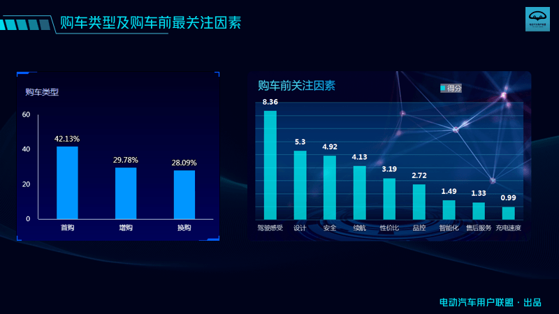 在購車類型上,42.13%的人是首購,首次購車就選30萬價位的電馬,基本上是購車一步到位了,這輛車估計很多人都會開5年左右。增購用戶占比29.78%,這些人家里不止一輛車;70.22%的車主家里只有電馬一輛車。