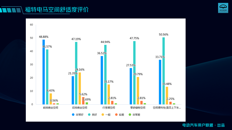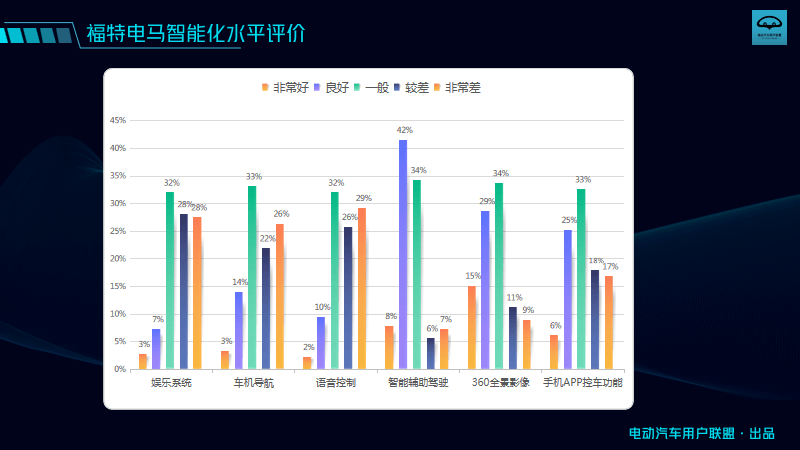 具體來看,對于電馬的輔助駕駛,有50%的人給出了良好及非常好的評價,34%的人覺得一般。對于電馬的車機,在娛樂、導航、語音控制、手機APP控車等方面,車主們感覺較為一般。