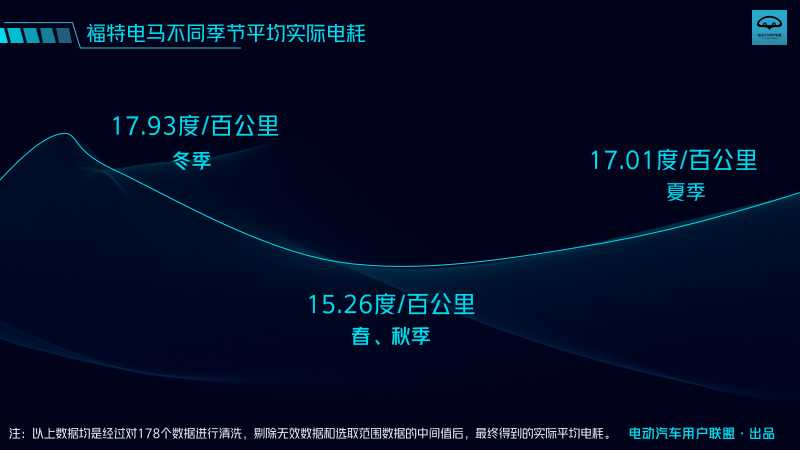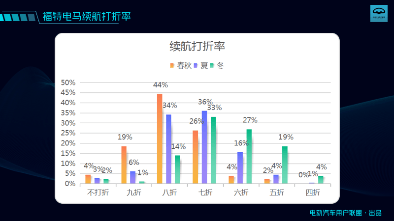 本次調研結果顯示,在春秋兩季,電馬續(xù)航折扣率在7-9折之間,夏季續(xù)航折扣在6-8折,冬季續(xù)航折扣在5-8折;春秋兩季平均電耗是15.26kWh/100km,夏季平均電耗為17.1 kWh/100km,冬季平均電耗為17.93 kWh/100km。