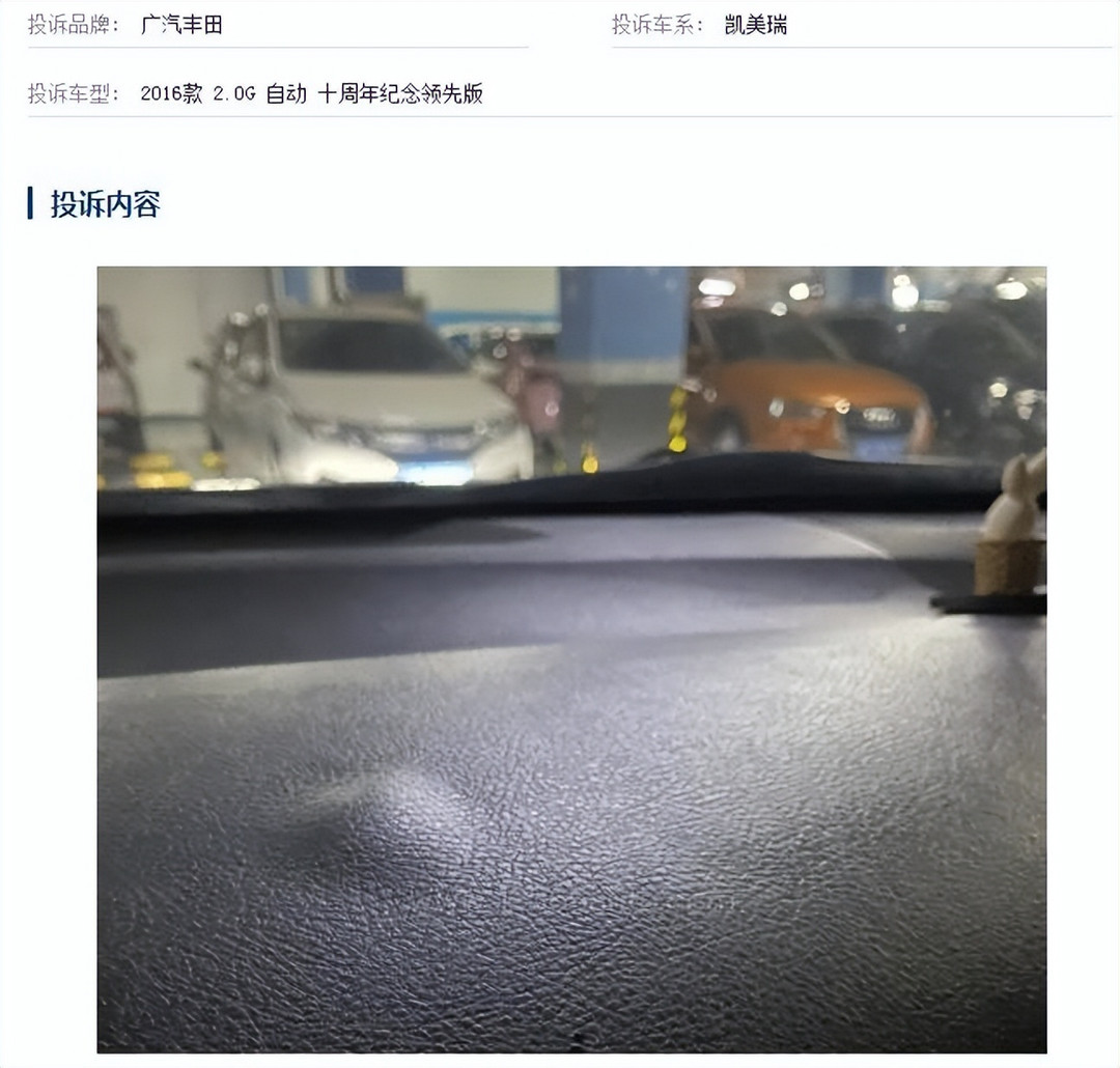 最晚則延續(xù)到2016年凱美瑞2.0G 自動(dòng)領(lǐng)先版。投訴的原因也非常的一致,即儀表臺開裂,部件老化問題。