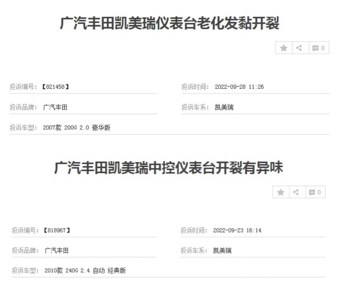 類似的車主不在少數(shù),如下圖的2007款、2010款凱美瑞車主同樣遭遇了儀表臺老化等問題。