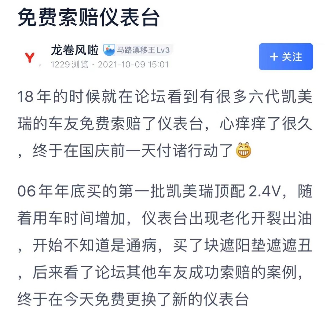隨之,筆者也來到了凱美瑞車主的論壇,看看其他車主在遭遇內(nèi)飾開裂的問題上,他們又是如何處理的。然而可以稱畫風(fēng)大變,如ID名為龍卷風(fēng)啦,作為2006年第一批凱美瑞的頂配車主,在同樣遭遇儀表臺出現(xiàn)老化開裂的現(xiàn)象,他得到了廠商提供的免費(fèi)更換儀表臺服務(wù)。