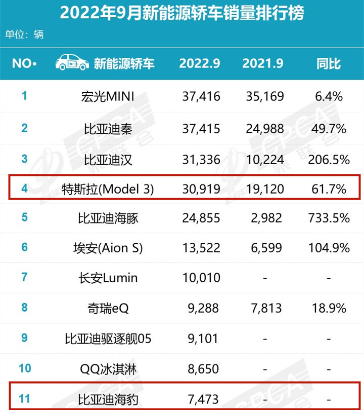 例如9月份,Model 3在銷量上就面臨著比亞迪漢、比亞迪海豚的前后夾擊。