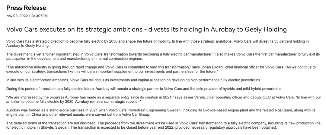 11月8日,沃爾沃汽車發(fā)布公告稱到2030年實現(xiàn)全電動化,為此,沃爾沃汽車將把其在Aurobay的33%股份剝離給吉利控股,該交易預(yù)計將在2022年底前完成。未來,沃爾沃汽車將把投資和資本分配的重點放在開發(fā)高性能的全電動動力系統(tǒng)上。這是全球第一家完全退出內(nèi)燃機開發(fā)和制造的汽車制造商。