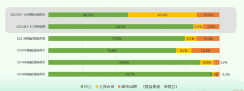 在新能源領(lǐng)域,中國品牌的先發(fā)優(yōu)勢演變?yōu)楫a(chǎn)品優(yōu)勢、市場優(yōu)勢。自主品牌牢牢掌握市場主導(dǎo)權(quán),主流合資品牌受新能源產(chǎn)品起步晚、投放車型數(shù)量少等制約,1-10月市場份額僅5.6%。