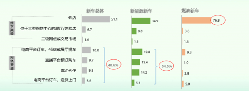 調(diào)查結(jié)果顯示,新能源汽車新車用戶(含潛在)對網(wǎng)絡(luò)渠道接受度更高,燃油車用戶選擇4S店購車的比例為76.8%,新能源用戶只有34.9%,而通過車企APP、電商平臺、直播平臺等網(wǎng)絡(luò)渠道購車的比例則達(dá)到54.5%,渠道的多元化趨勢明顯。