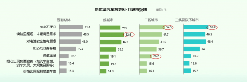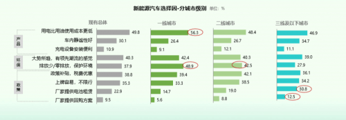 調(diào)查結(jié)果顯示,一線城市用戶對純電動汽車接受度高,滲透率達(dá)到56%,二線城市純電動車滲透率42%,而三線城市用戶對純電、插電和增程式的喜好差異不大。