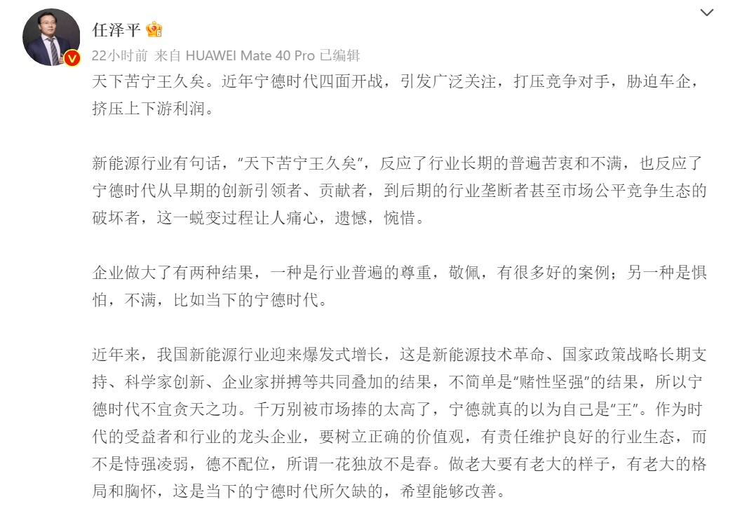 1月9日,經(jīng)濟(jì)學(xué)家任澤平發(fā)博痛斥寧德時(shí)代,稱后者“近年來(lái)四面開(kāi)戰(zhàn),打壓競(jìng)爭(zhēng)對(duì)手,脅迫車企,積壓上下游利潤(rùn)”,并指責(zé)寧德時(shí)代“德不配位,恃強(qiáng)凌弱,沒(méi)有老大格局”,引起行業(yè)熱議。