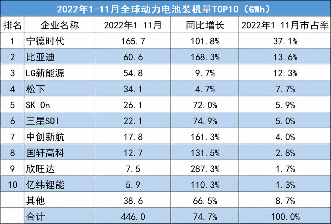 數(shù)據(jù)顯示,2022年1-11月,寧德時(shí)代市占率達(dá)到37.1%,比去年同期的32.2%上漲了近5個(gè)百分點(diǎn),幾乎是第二名市場(chǎng)份額的3倍;比亞迪一路過(guò)關(guān)斬將,將松下、LG新能源先后擠了下去,排名第二;而日韓企業(yè)占據(jù)了3-6名,市場(chǎng)份額分布在5%-12%這個(gè)區(qū)間;第7-10名則全部由中國(guó)企業(yè)占據(jù):中創(chuàng)新航、國(guó)軒高科、欣旺達(dá)和億緯鋰能。