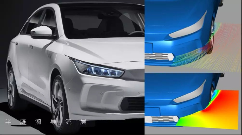 譬如,車頭部分。除了給 GE11 塑造出低趴的車頭輪廓和流線型電動(dòng)機(jī)艙蓋外,吉利還有一個(gè)半漣漪導(dǎo)流層。通過型面設(shè)計(jì),避免側(cè)圍氣流的分離,同時(shí)保護(hù)輪胎免受氣流的直接沖擊。