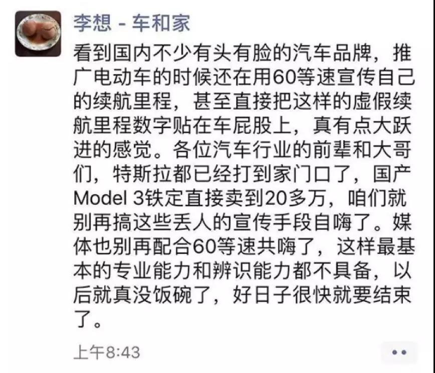 車和家創(chuàng)始人李想據(jù)此在微博上抨擊“國內不少有頭有臉的汽車品牌”搞“虛假續(xù)航里程”,也就是以60公里/時等速宣傳電動車續(xù)航里程,“太丟人了”。“各位汽車行業(yè)的前輩和大哥們,特斯拉都已經打到家門口了,按照目前的匯率,國產Model 3鐵定直接賣到25-27萬元起(補貼前售價),咱們就別再搞這些丟人的宣傳手段自嗨了?!彼^續(xù)寫道,“媒體也別再配合60公里/時等速共嗨了,這樣最基本的專業(yè)能力和辨識能力都不具備,以后就真沒飯碗了,好日子很快就要結束了?!?/p>