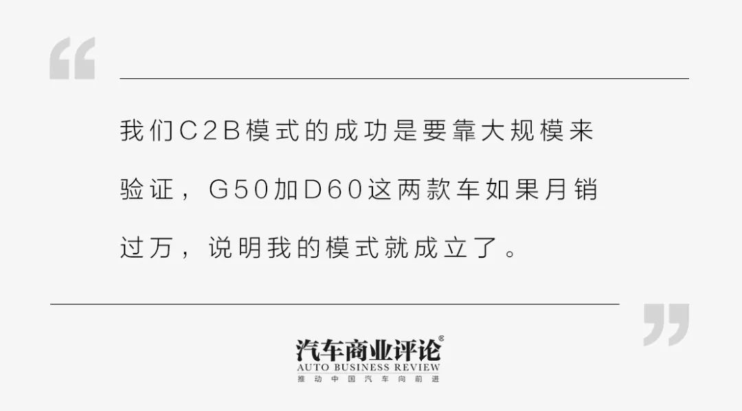 藍(lán)青松:我們C2B模式的成功是要靠大規(guī)模來(lái)驗(yàn)證,G50加D60這兩款車(chē)如果月銷(xiāo)過(guò)萬(wàn),說(shuō)明我的模式就成立了。
