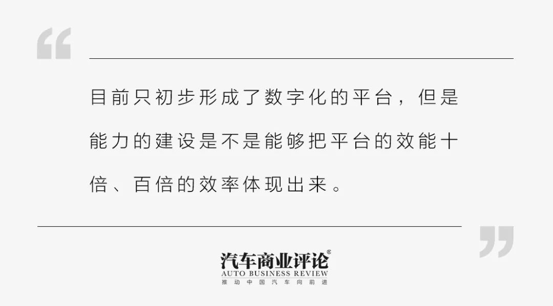 平臺(tái)化的能力,還是互聯(lián)網(wǎng)化,平臺(tái)化能力是重點(diǎn)。目前只初步形成了數(shù)字化的平臺(tái),但是能力的建設(shè)是不是能夠把平臺(tái)的效能十倍、百倍的效率體現(xiàn)出來(lái)?還需要驗(yàn)證。