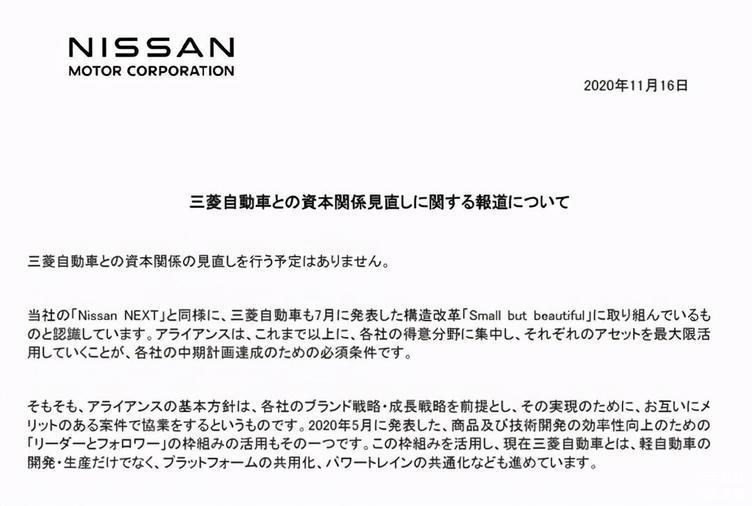 截至目前,三菱汽車拒絕對資本關(guān)系一事予以置評,但日產(chǎn)方面則于16日下午發(fā)表聲明,表示該公司不打算重新評估與三菱汽車的資本關(guān)系,并對外強調(diào)了穩(wěn)固三菱關(guān)系對聯(lián)盟中期戰(zhàn)略的重要性。