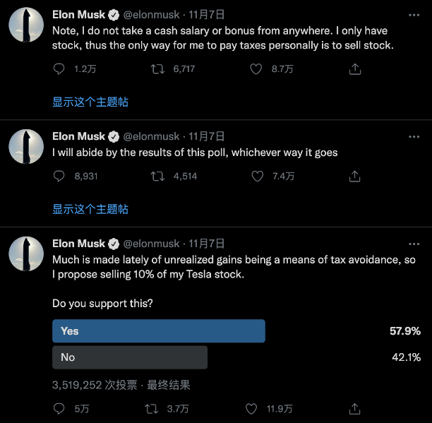 11月7日,特斯拉CEO埃隆·馬斯克(Elon Musk)在推特發(fā)起一項投票,表示因為“很多未實現(xiàn)收益是避稅的一種手段”,所以為了“避嫌”,馬斯克決定出售其本人10%的股票。“你們是否支持這項提議?”