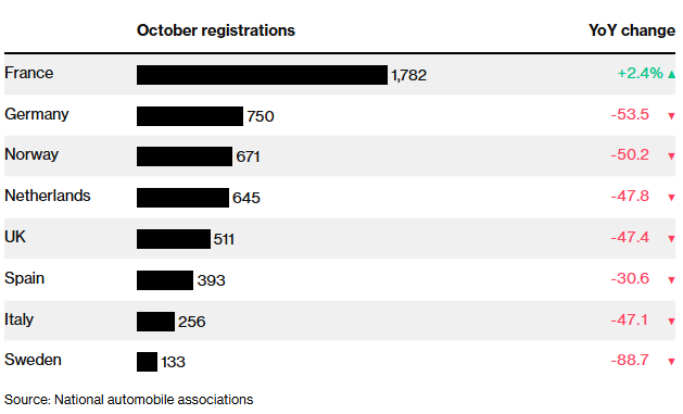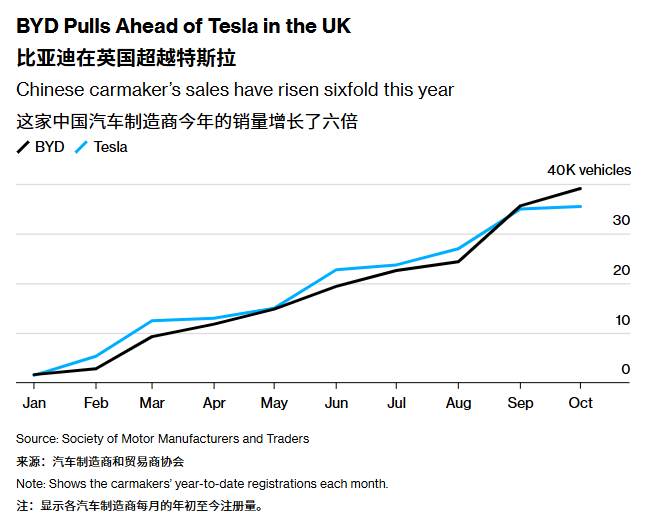 11月5日,比亞迪在英國市場的銷量表現(xiàn)超越特斯拉。英國汽車制造商和貿(mào)易商協(xié)會(SMMT)數(shù)據(jù)顯示,10月份比亞迪在英國登記的新車數(shù)量接近特斯拉的七倍。今年迄今,比亞迪在英國的銷量增長超過六倍,達(dá)到39,103輛,而特斯拉銷量下滑4.5%,至35,455輛。此外,德國聯(lián)邦機動車運輸管理局(KBA)數(shù)據(jù)顯示,10月份比亞迪在德國的注冊量超過特斯拉四倍以上,今年前10個月累計,比亞迪僅落后特斯拉424輛。