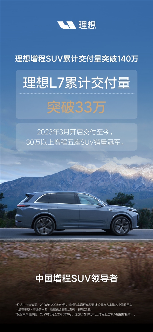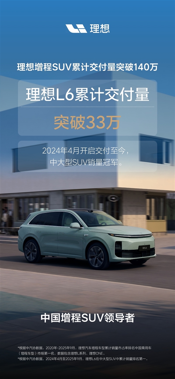 11月10日,理想汽車宣布其增程SUV累計交付量突破140萬輛,各車型交付數(shù)據(jù)亮眼。理想L6自2024年4月開啟交付以來,累計交付量突破33萬輛,成為中大型SUV銷量冠軍。理想L7自2023年3月開啟交付至今,累計交付量同樣突破33萬輛,成為30萬以上增程五座SUV銷量冠軍。理想L8自2022年11月開啟交付至今,累計交付量突破25萬輛,成為30-40萬六座車型銷量冠軍。理想L9自2022年8月開啟交付至今,累計交付量突破28萬輛,成為全尺寸SUV銷量冠軍。理想ONE累計交付量突破20萬輛,曾是2021年中大型SUV銷量冠軍。
