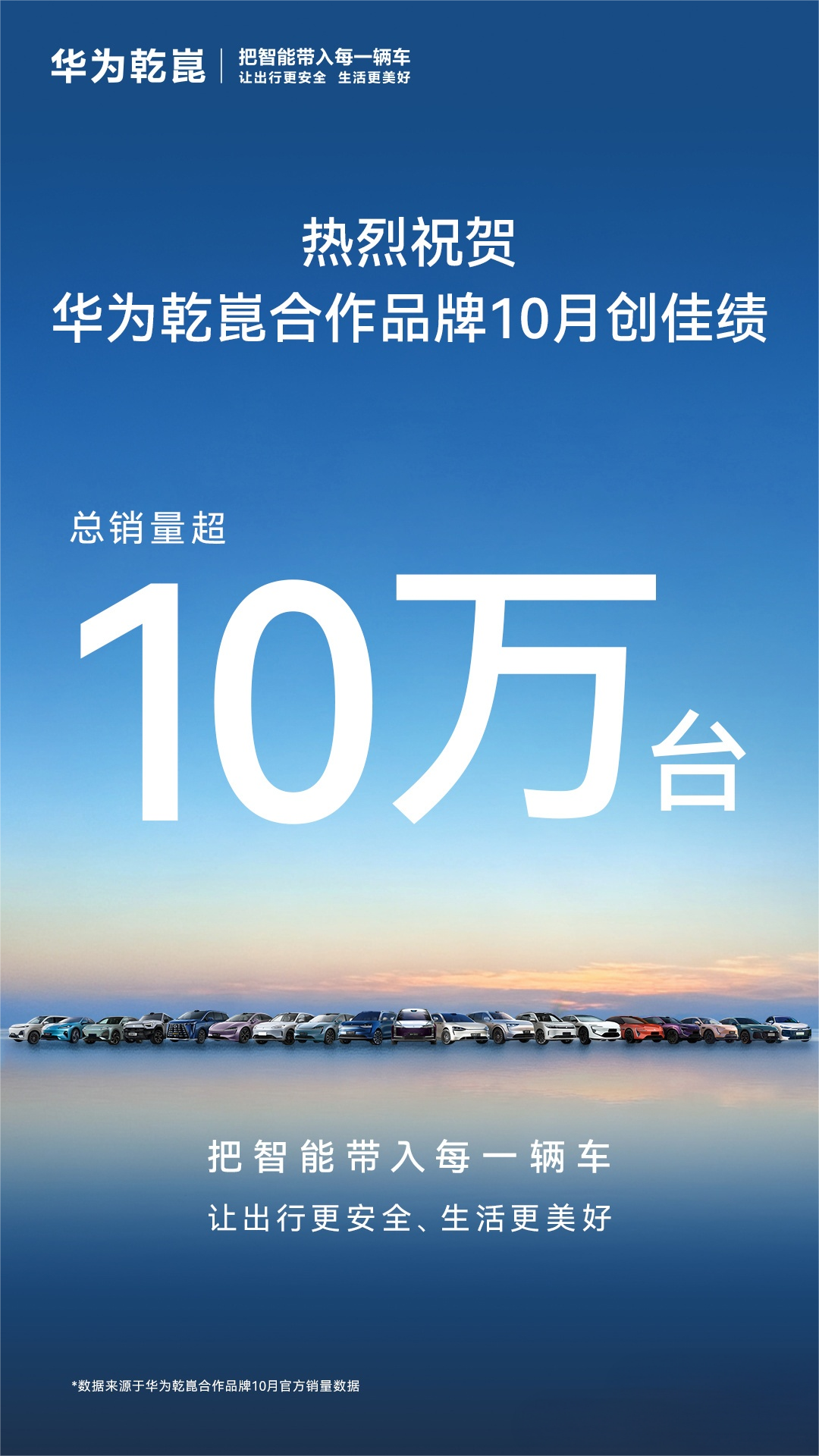 11月10日消息,華為乾崑智能汽車解決方案官方微博宣布,10月華為乾崑合作品牌總銷量超過10萬臺,博主@孫少軍稱是以高端車型為主,鴻蒙智行上周新增訂單1.2萬,尊界交付量創(chuàng)新高。