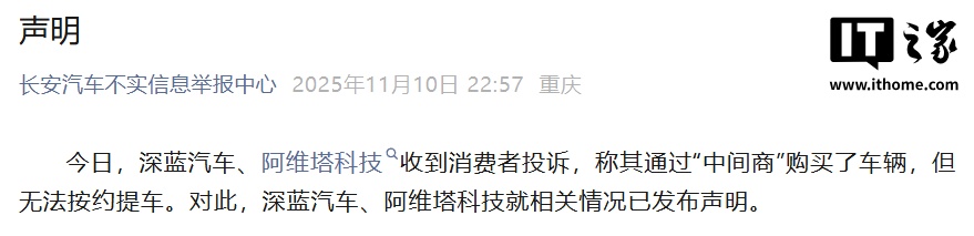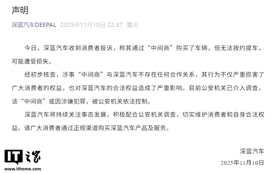 11月10日,阿維塔科技和深藍(lán)汽車發(fā)布聲明,回應(yīng)消費(fèi)者關(guān)于通過“中間商”購車卻無法按約定提車的投訴。經(jīng)核查,涉事“中間商”與阿維塔及深藍(lán)汽車并無合作關(guān)系,其行為不僅侵害了消費(fèi)者權(quán)益,也影響了兩家公司的合法權(quán)益。目前,公安機(jī)關(guān)已介入調(diào)查,涉事“中間商”因涉嫌犯罪被控制。阿維塔和深藍(lán)汽車表示將持續(xù)關(guān)注事件進(jìn)展,并積極配合調(diào)查,同時(shí)呼吁消費(fèi)者通過正規(guī)渠道購買產(chǎn)品及服務(wù)。