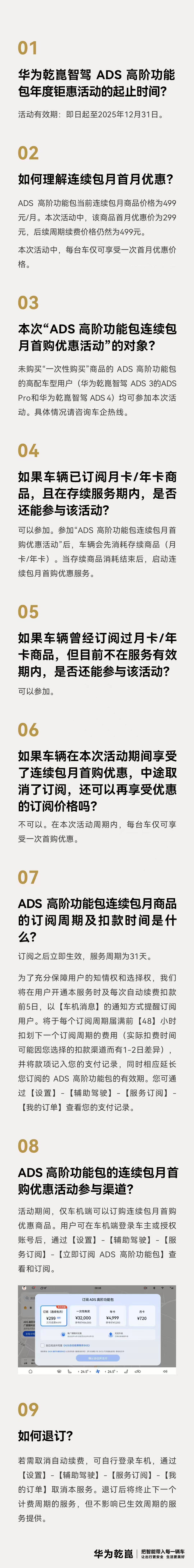 11月11日,華為宣布推出乾崑智駕ADS高階功能包的優(yōu)惠活動(dòng)。從即日起至12月31日,該功能包的“連續(xù)包月商品”首月價(jià)格由499元降至299元。需要注意的是,此次優(yōu)惠僅適用于首月,之后的服務(wù)周期續(xù)費(fèi)價(jià)格將恢復(fù)至499元/月,且每臺(tái)車僅有一次享受首月優(yōu)惠的機(jī)會(huì)。