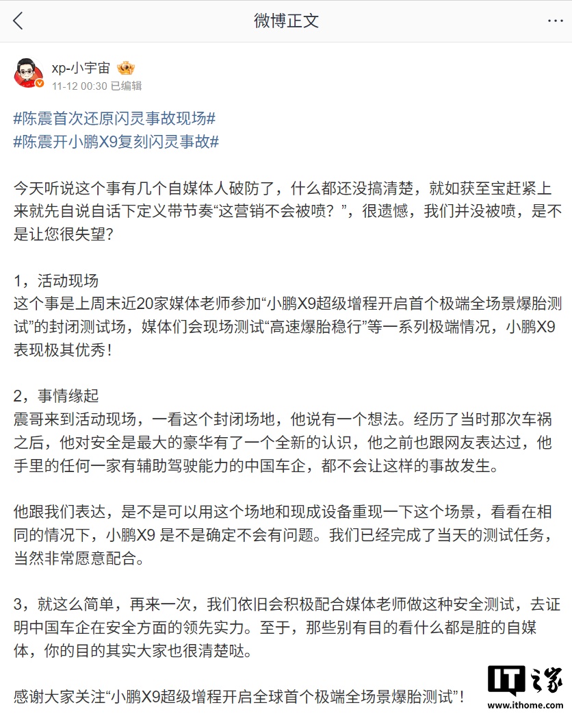 11月11日,車評人陳震在測試場駕駛小鵬X9復(fù)刻了其“勞斯萊斯閃靈事故”場景。小鵬汽車員工@xp-小宇宙發(fā)文回應(yīng)稱,這是在“小鵬X9超級增程開啟首個極端全場景爆胎測試”活動中,陳震提出的想法。他表示,經(jīng)歷了車禍后,對安全是最大的豪華有了新的認識,認為任何一家有輔助駕駛能力的中國車企都不會讓這樣的事故發(fā)生。小鵬汽車員工表示,他們愿意配合媒體老師做這種安全測試,證明中國車企在安全方面的領(lǐng)先實力。