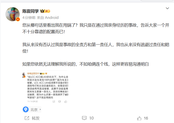 陳震此前曾公開表示,盡管知道閃靈的輔助駕駛不如中國(guó)品牌,但沒想到作為地球上最貴的電動(dòng)車,同時(shí)也是勞斯萊斯科技配置最高的車型,其主動(dòng)安全性能會(huì)如此不足。他直言,如果勞斯萊斯閃靈具備華為ADS輔助駕駛,他不介意多花100萬(wàn)元購(gòu)買。2025年10月3日,陳震發(fā)生交通事故,北京交警通報(bào)事故雙方均未涉酒涉毒,陳震負(fù)事故全部責(zé)任。陳震隨后通過社交媒體道歉,并承諾配合有關(guān)部門處理并承擔(dān)賠償。10月14日,陳震透露事故原因是使用了輔助駕駛。10月18日,陳震在接受媒體采訪時(shí)首次還原事故經(jīng)過,并表示已賣掉勞斯萊斯閃靈,以后大概率不會(huì)再購(gòu)買。