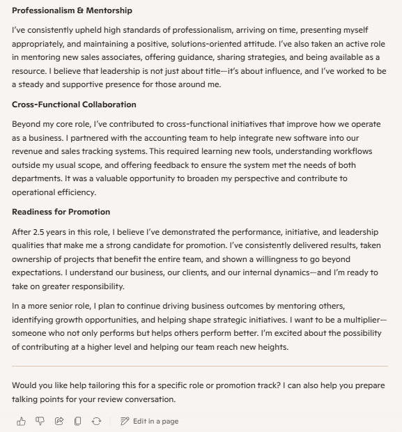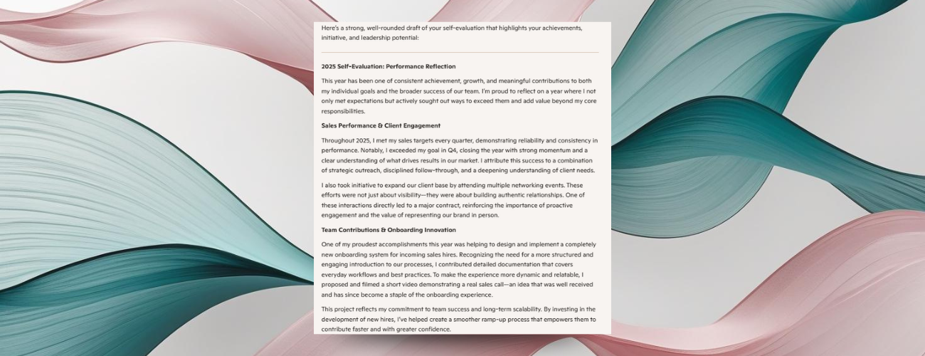 此外,Copilot在個人自評環(huán)節(jié)展現(xiàn)了強大的數(shù)據(jù)整合能力,能夠從用戶的電子郵件、OneNote頁面、狀態(tài)報告及演示文檔中抓取關鍵信息,自動生成詳盡的自我評估報告。微軟的案例中,Copilot成功梳理了員工的季度銷售業(yè)績、新流程開發(fā)的貢獻以及導師輔導工作等核心亮點,確保這些容易被遺忘的“隱形貢獻”被完整納入年終考核中。