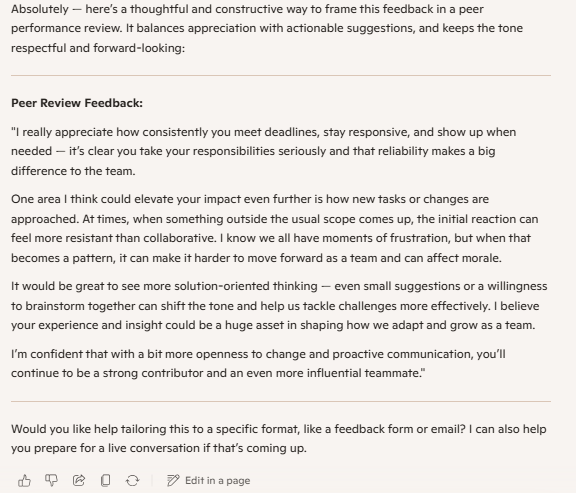 在同事互評環(huán)節(jié),Copilot充當了“職場潤滑劑”的角色,有效軟化語言基調,建議使用鼓勵性而非嚴厲的措辭。例如,當員工需要評價一位能力尚可但態(tài)度消極的同事時,Copilot能夠重寫評價內容,在指出問題的同時保持支持性的語調,降低溝通風險。