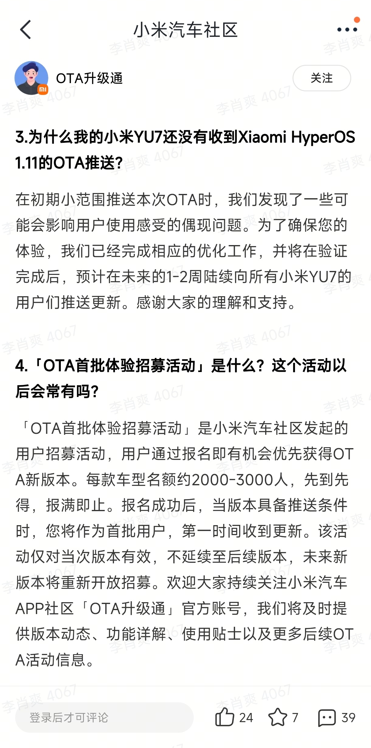 12月11日,小米汽車副總裁李肖爽在微博發(fā)文,承認(rèn)小米YU7的最新OTA推送進(jìn)度慢于預(yù)期。他分享了小米汽車App社區(qū)的Q&A說明,解釋了小米YU7尚未收到XiaomiHyperOS1.11的OTA推送的原因。在初期小范圍推送本次OTA時(shí),小米發(fā)現(xiàn)了一些可能會影響用戶使用感受的偶現(xiàn)問題。為確保用戶體驗(yàn),小米已完成相應(yīng)的優(yōu)化工作,并將在驗(yàn)證完成后,預(yù)計(jì)在未來1-2周陸續(xù)向所有小米YU7用戶推送更新。