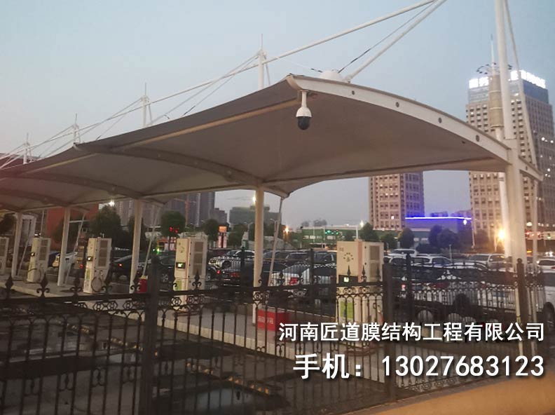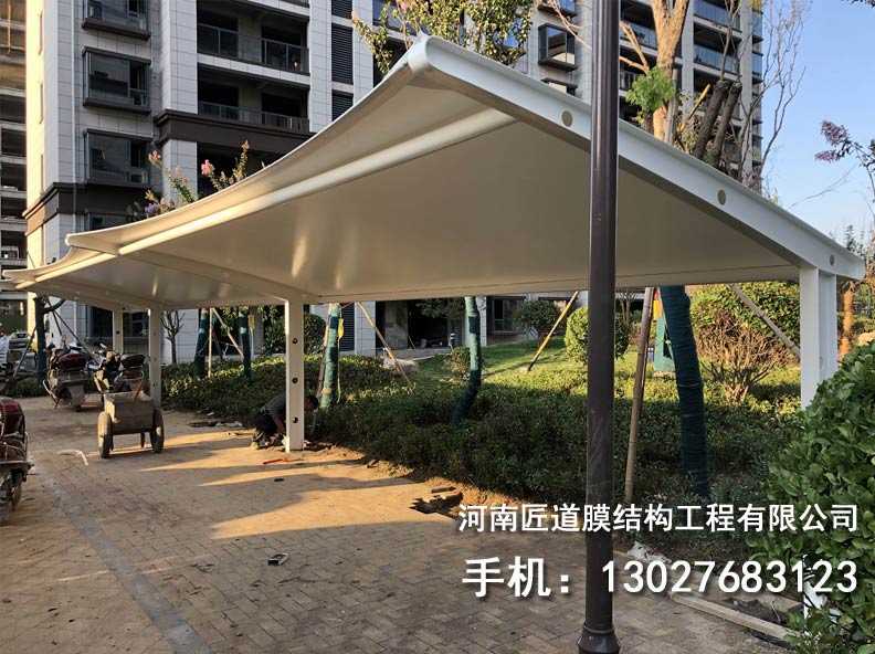 1、膜結構車棚的篷布材質是PVC、PVDF、PTFE聚酯類,而膜材的特點是強度高、耐久性好、防火難燃、自潔性好,不受紫外線影響,使用壽命長,一般15-30年。